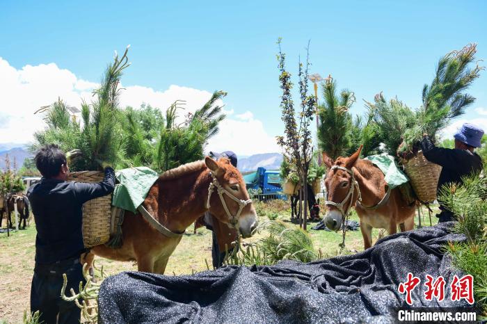 圖為拉薩南北山綠化工程,工人用騾子搬運(yùn)樹(shù)苗 貢嘎來(lái)松 攝