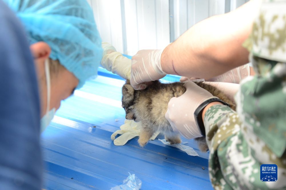 圖為2021年7月11日,工作人員在西寧野生動物園里為2個月大的小兔猻打疫苗。(西寧野生動物園供圖)