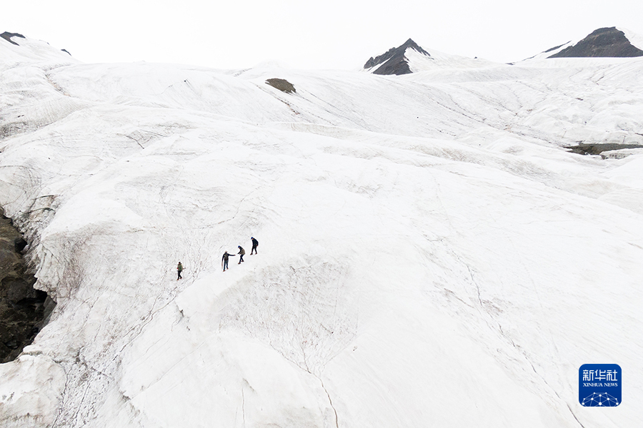 7月28日,來(lái)自長(zhǎng)江科學(xué)院的科考隊(duì)員在長(zhǎng)江源格拉丹東雪山上(無(wú)人機(jī)照片)。新華社記者肖藝九 攝