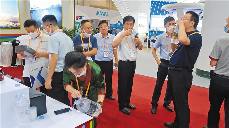近年來(lái),西藏加快發(fā)展飲用水產(chǎn)業(yè),積極拓展飲用水產(chǎn)品銷售渠道,在區(qū)內(nèi)外各種展覽會(huì)、展銷會(huì)、博覽會(huì)上大力推銷水產(chǎn)品。 圖為2020廈門(mén)國(guó)際投資貿(mào)易洽談會(huì)暨絲路投資大會(huì)上,與會(huì)者在展示展銷會(huì)現(xiàn)場(chǎng)品鑒西藏“地球第三極”產(chǎn)業(yè)發(fā)展有限公司生產(chǎn)的天然飲用水產(chǎn)品。(資料圖片)記者 王超 攝