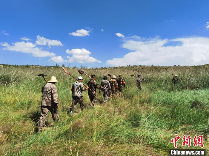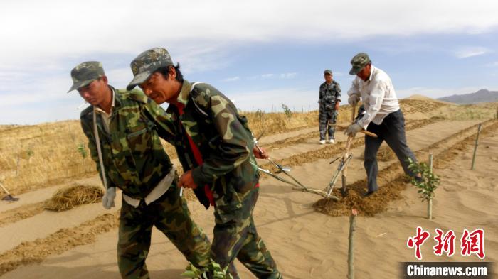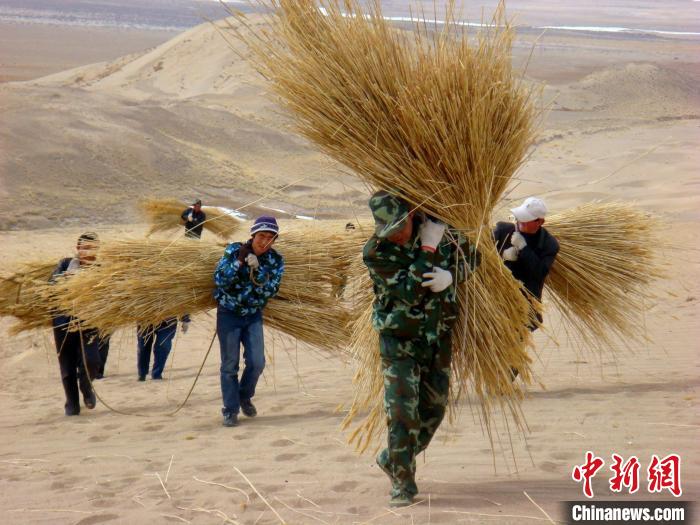 資料圖為固沙工程人工運草?!跆m縣委宣傳部供圖