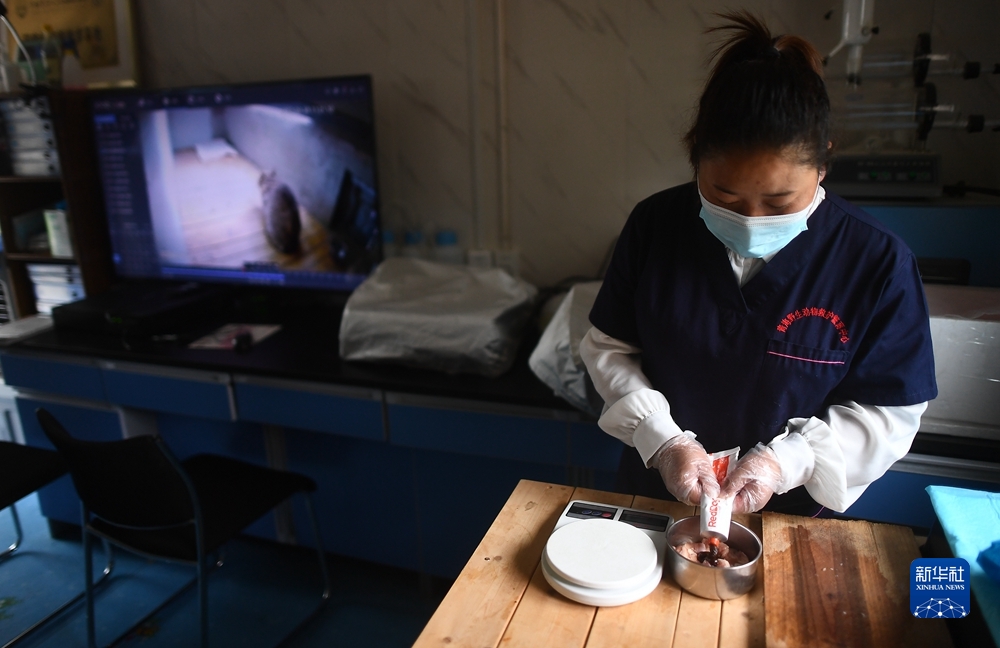 9月18日,青海野生動(dòng)物救護(hù)繁育中心工作人員虎文蓉在給荒漠貓準(zhǔn)備的晚餐中加入營(yíng)養(yǎng)膏。新華社記者 張宏祥 攝
