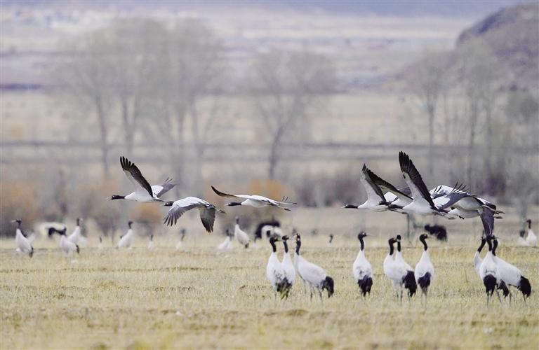 隨著節(jié)氣轉(zhuǎn)換、氣候變冷,拉薩市林周縣境內(nèi)迎來了大批飛抵越冬的黑頸鶴,它們將在這里一直待到來年的三四月份。