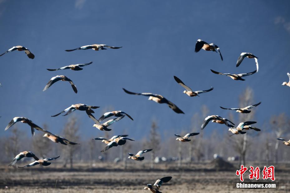 近年來,拉薩水系治理工程的實施,讓拉薩河周邊環(huán)境變得更好。每年10月中下旬,來拉薩越冬的候鳥不斷增多,在拉薩河畔處處都能看見斑頭雁、紅嘴鷗、黃麻鴨等鳥類的身影。據(jù)悉,目前,拉薩河城區(qū)段形成了3公里長的湖面水城,水城面積達1258畝,平均水深2.5米,蓄水量約105萬立方米,不僅增加了空氣濕度、含氧量,完善了城市防洪體系,還提高了地下水位,鳥類種群數(shù)量增加。圖為一群黃麻鴨在拉薩河畔的農(nóng)田上飛翔。 貢嘎來松 攝