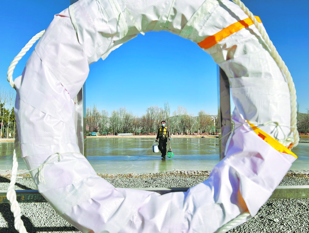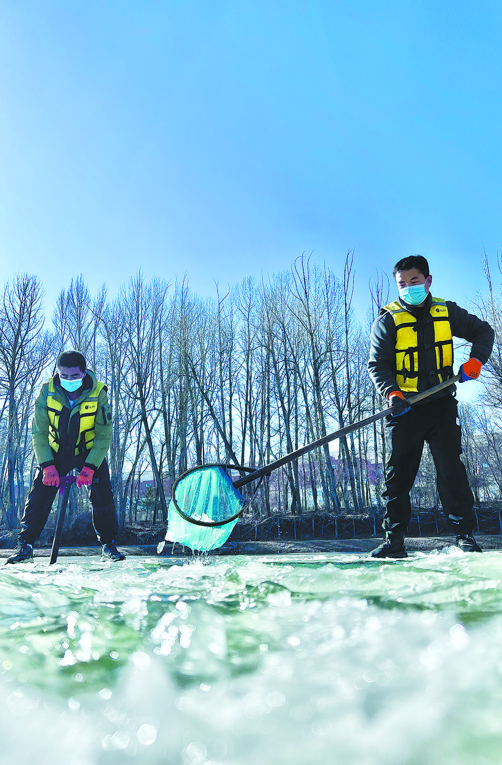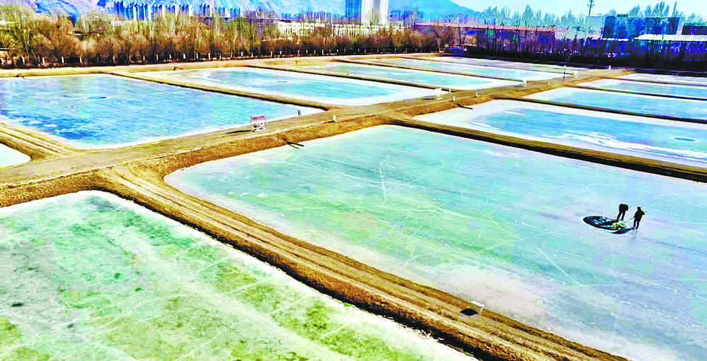 陽光透過冰面照射在18口冰封的魚塘里,為過冬的小魚苗增氧增溫。這片池塘是裸鯉來到裸鯉救護(hù)中心的第一站,田文根是這里的一名工作人員,主要負(fù)責(zé)室外原種場(chǎng)魚苗的培育和水質(zhì)監(jiān)測(cè)工作。據(jù)他介紹,魚塘的水質(zhì)決定著魚苗的健康狀況。在冬季,及時(shí)掃雪是一項(xiàng)非常重要的工作,因?yàn)楸鶎酉旅娴穆沲庺~苗是靠浮游植物通過光合作用產(chǎn)生的氧氣生存,如果雪附著在冰層上,陽光無法透進(jìn),就容易造成缺氧。