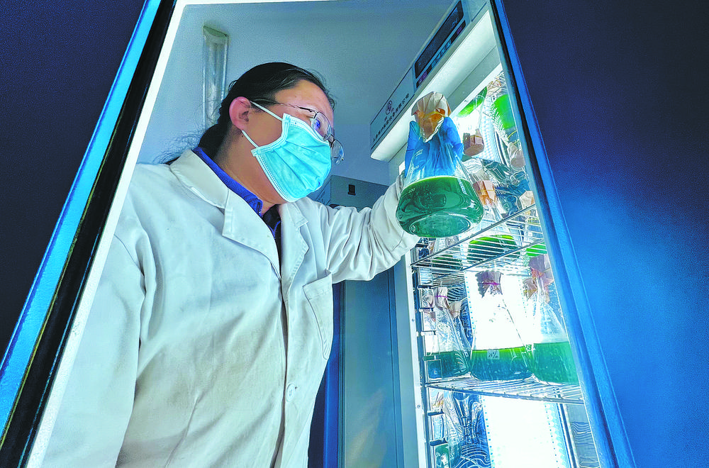技術(shù)人員正在觀察小球藻生長(zhǎng)情況。