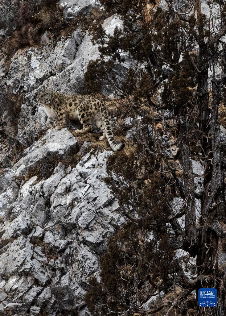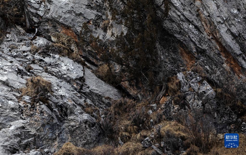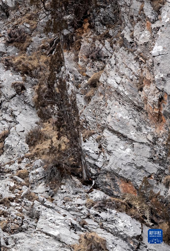 2月21日,在青海省玉樹藏族自治州雜多縣昂賽鄉(xiāng)境內的昂賽大峽谷內,一只雪豹在向上攀爬。新華社記者 費茂華 攝
