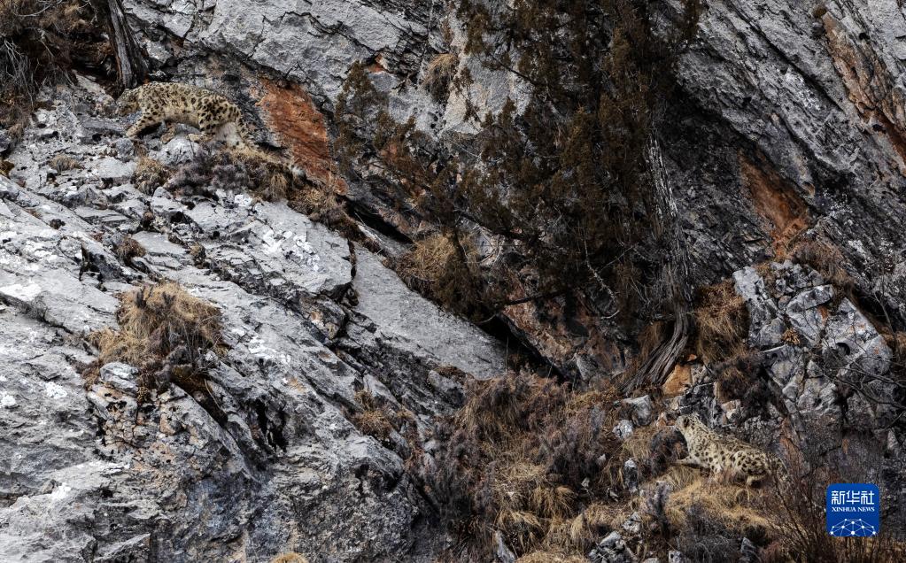 2月21日,在青海省玉樹藏族自治州雜多縣昂賽鄉(xiāng)境內的昂賽大峽谷內,兩只雪豹在向上攀爬。新華社記者 費茂華 攝