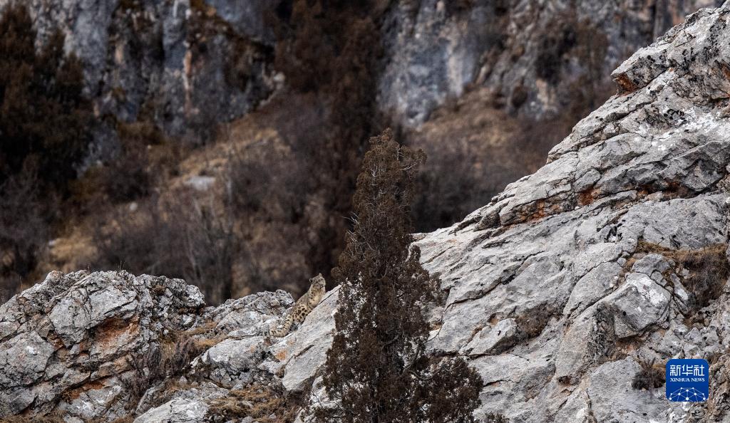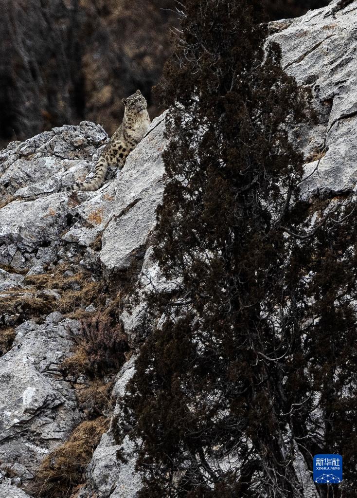 2月21日,在青海省玉樹藏族自治州雜多縣昂賽鄉(xiāng)境內的昂賽大峽谷內,一只雪豹準備向上攀爬。新華社記者 費茂華 攝