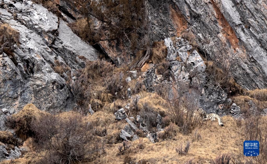 2月21日,在青海省玉樹藏族自治州雜多縣昂賽鄉(xiāng)境內的昂賽大峽谷內,一只雪豹在休息。新華社記者 費茂華 攝