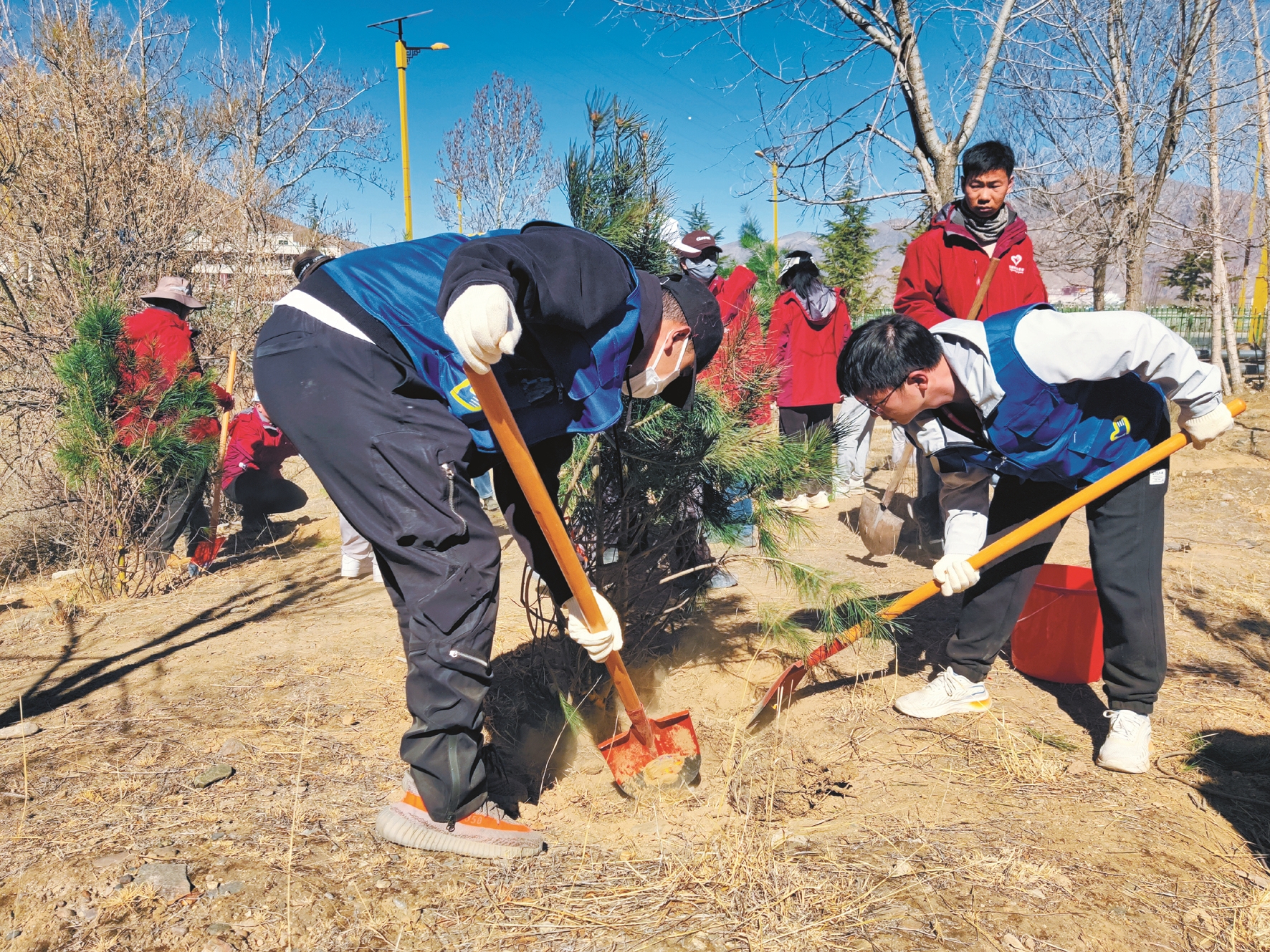 現(xiàn)場(chǎng),志愿者手拿垃圾桶、夾子等工具,認(rèn)真清理地面上的垃圾。隨后,不同團(tuán)體志愿者被劃分為7個(gè)組開(kāi)始植樹(shù),大家干勁十足、配合默契,一起立苗、填土、澆水,有條不紊完成每道工序,并給每棵樹(shù)系上絲帶。經(jīng)過(guò)一番熱火朝天的勞動(dòng),一棵棵新栽下的樹(shù)苗昂然挺立,為初春的山坡增添了一片新綠?;顒?dòng)間隙,大家相互交流,憧憬著多年后荒灘變青山的場(chǎng)景。