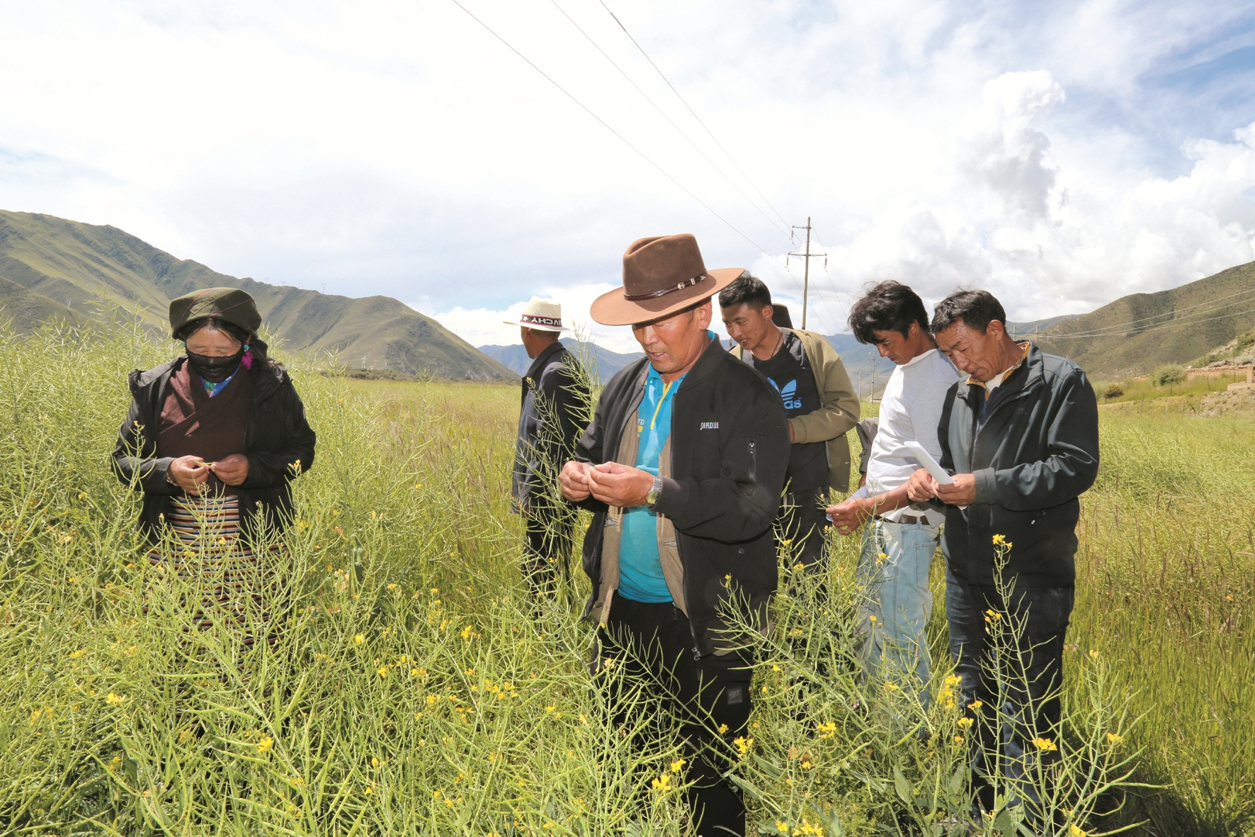 圖為考評組工作人員查看油菜長勢情況。拉薩融媒記者 余洋洋 通訊員 德吉卓嘎攝