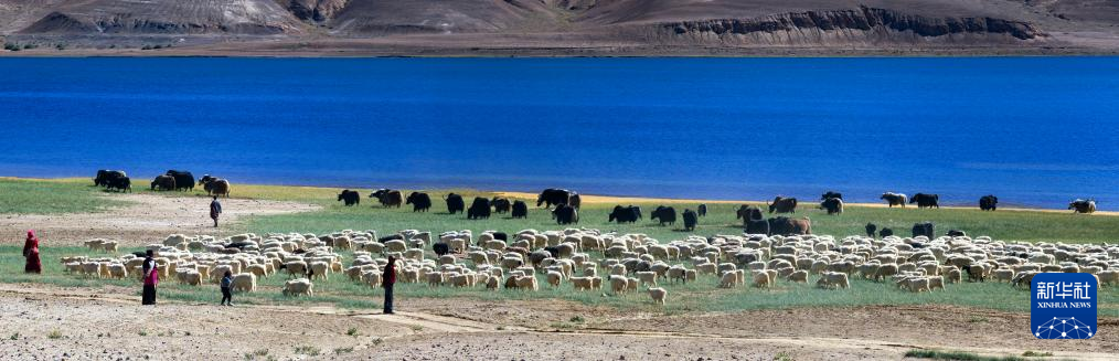 牧民在阿里地區(qū)日土縣班公湖畔放牧白絨山羊和牦牛(無人機(jī)照片,9月21日攝)。新華社記者 姜帆 攝