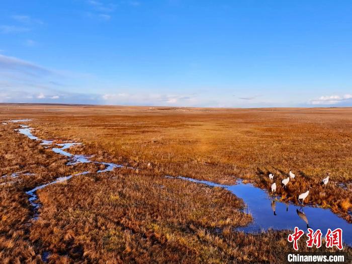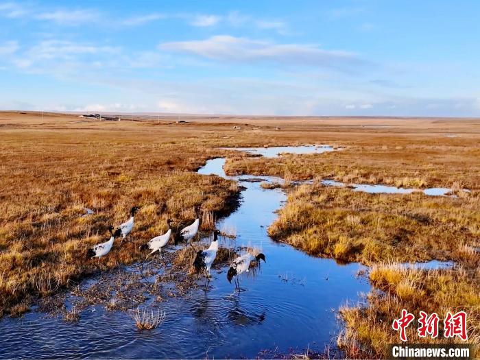 金秋十月,位于青海湖北岸的草原一片金黃。攝影愛好者在青海省海北藏族自治州剛察縣吉爾孟鄉(xiāng)日格加柔地區(qū),拍攝到六只黑頸鶴在這里“安家落戶”,它們或擠在一起沐浴秋日的暖陽(yáng),或三五成群覓食嬉戲、閑庭信步,為草原增添了一份靈動(dòng)與生機(jī)。黑頸鶴被稱為“高原仙子”“鳥類大熊貓”,是全球十五種鶴類中唯一在高原繁殖和棲息的鶴類。
