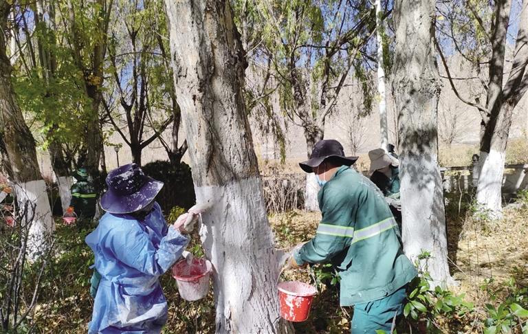 園林工人為樹木涂白防蛀蟲。 圖由拉薩城關(guān)區(qū)潔達(dá)園林綠化投資工程有限公司提供