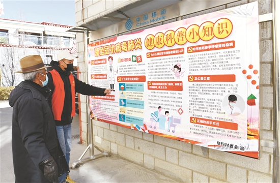 為大學(xué)生志愿者扎西平措在塔瑪小區(qū)內(nèi)的宣傳欄前給路過的居民普及防控知識。。(本組圖片由拉薩融媒視覺組攝)