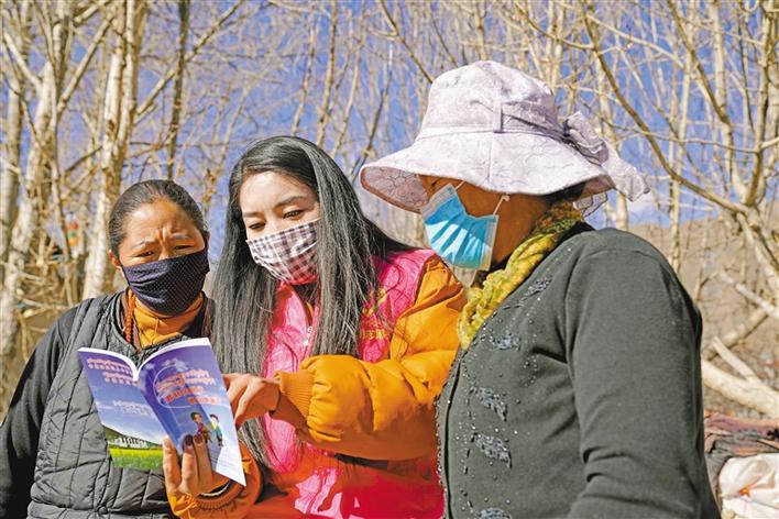 圖為近日,西藏山南市瓊結(jié)縣“四講四愛”群眾教育實(shí)踐活動(dòng)辦工作人員為村民宣講疫情防控知識(shí)及“講文明愛生活”內(nèi)容。 記者 耿銳仙 攝
