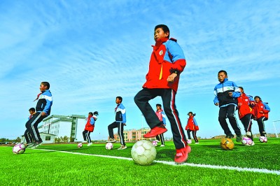 甘肅省民樂(lè)生態(tài)工業(yè)園區(qū)學(xué)校足球場(chǎng)上,學(xué)校足球隊(duì)的孩子們進(jìn)行傳球、帶球訓(xùn)練。王將攝/光明圖片