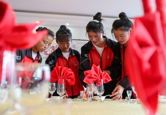 9月16日,寧夏西吉縣職業(yè)中學(xué)旅游服務(wù)與管理專業(yè)學(xué)生在學(xué)習(xí)中餐宴會擺臺實訓(xùn)課程。新華社記者 楊植森/攝