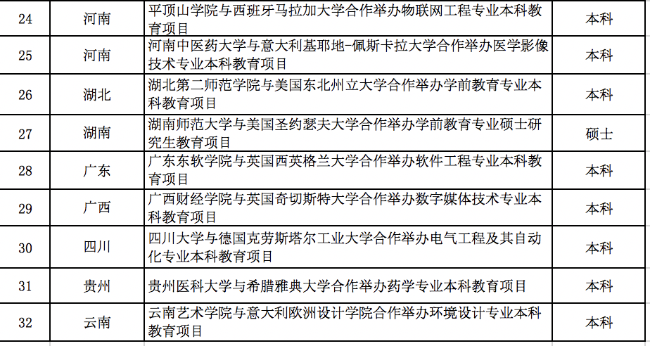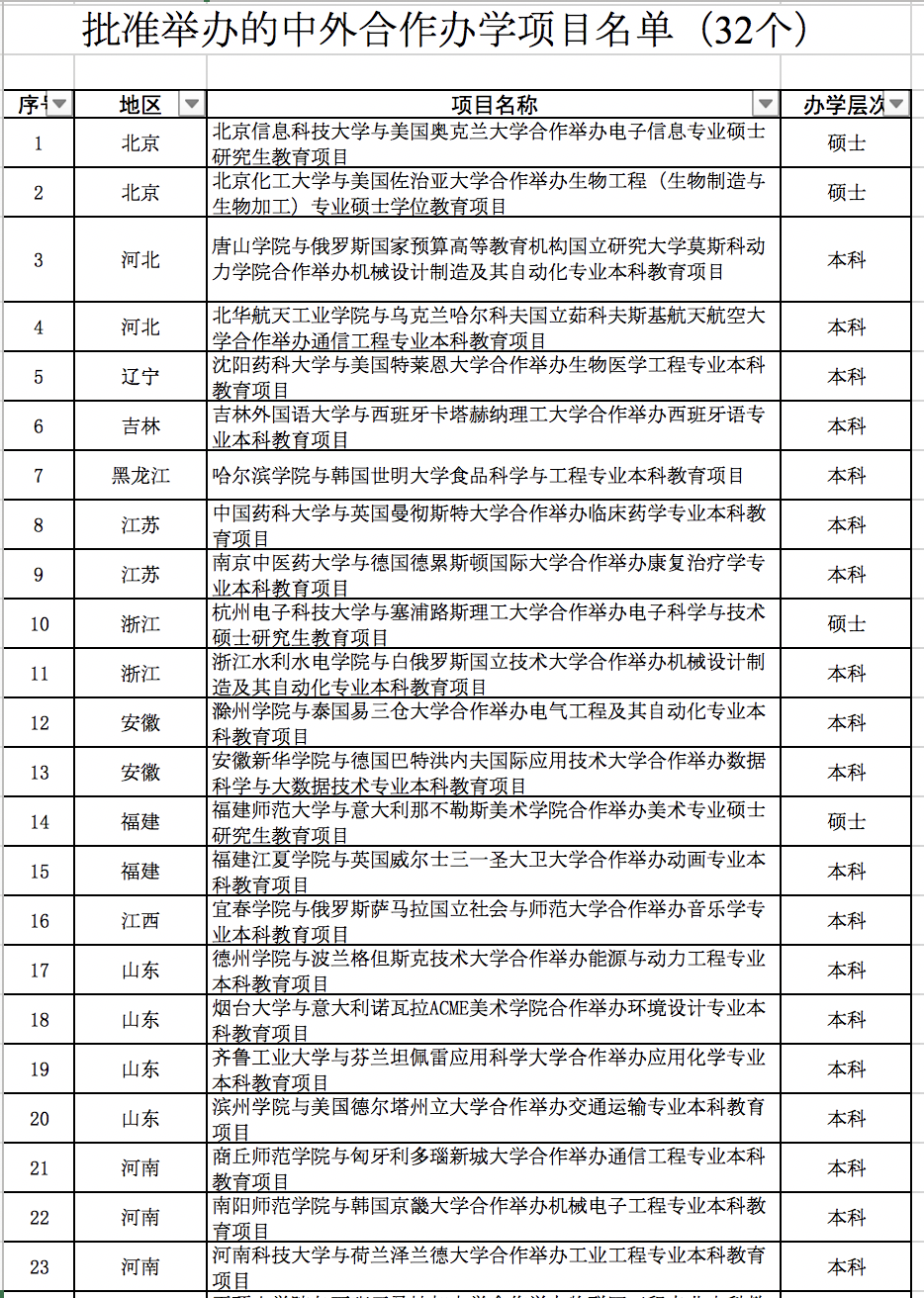 32個中外合作辦學(xué)項目名單如下: