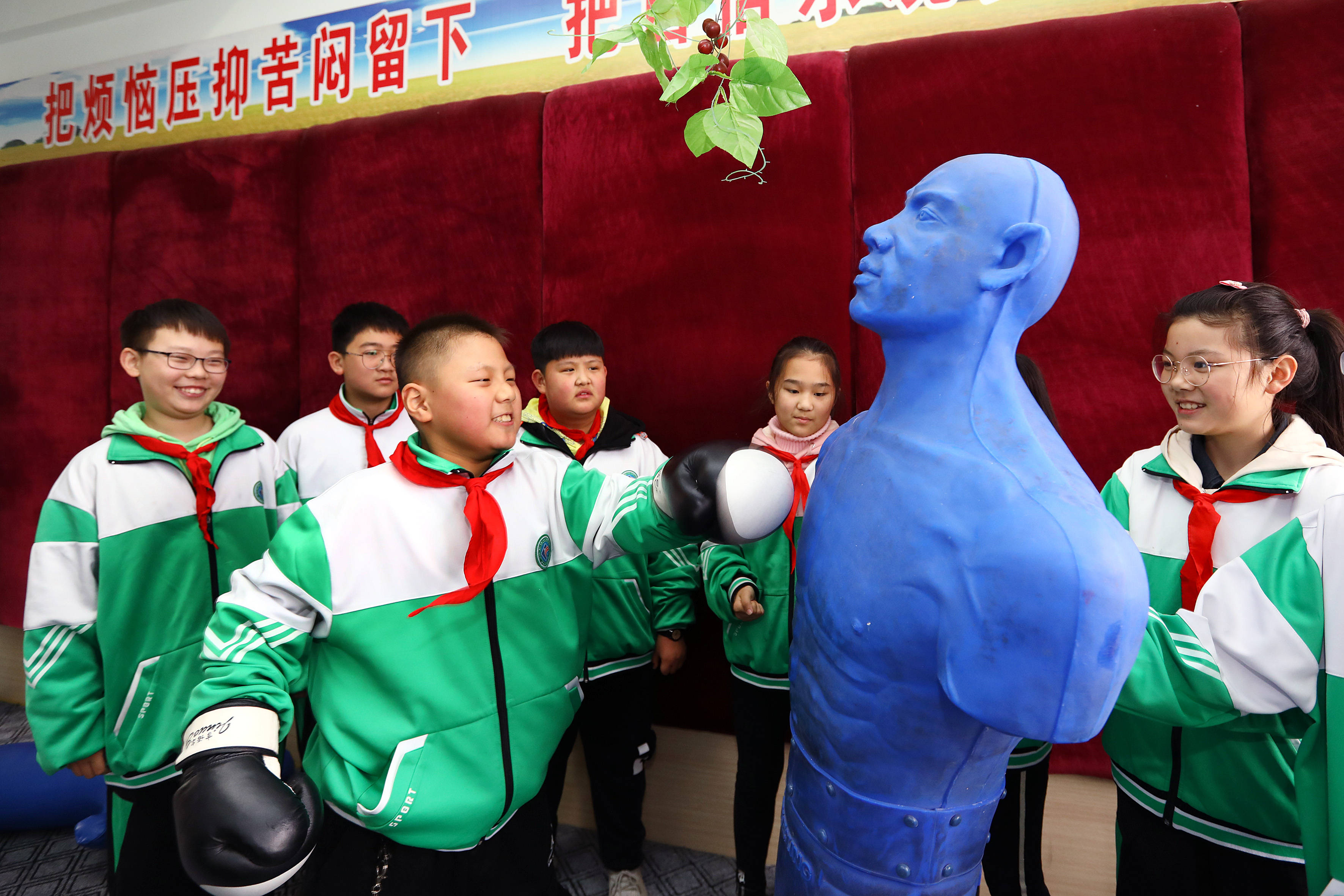 11月15日,安徽省淮北市的小學(xué)生在相山區(qū)未成年人心理健康輔導(dǎo)站宣泄室擊打橡皮人。