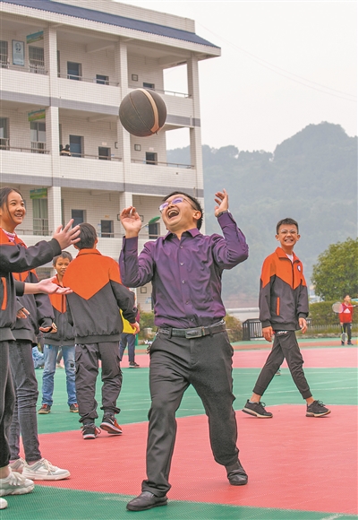 課余時(shí)間,李友生與孩子們打籃球玩鬧,開心得像個(gè)孩子。劉磊 攝