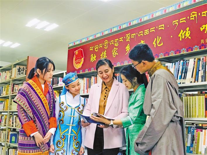 共青團(tuán)西藏自治區(qū)委員會副書記格桑卓瑪(中),在武漢西藏中學(xué)設(shè)立的“觸摸家鄉(xiāng)變化·傾聽黨的聲音”主題書刊欄處向?qū)W生們介紹相關(guān)書籍。