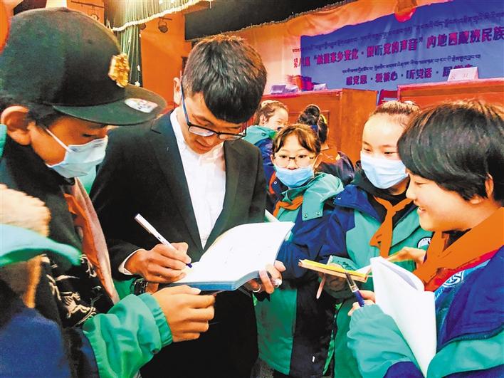 宣講活動(dòng)過程中,共青團(tuán)西藏自治區(qū)委員會副書記格桑卓瑪、西藏青年報(bào)社副社長洛桑頓珠給6所學(xué)校內(nèi)地西藏班的學(xué)生們贈送了《西藏青年報(bào)》《西藏青年》等刊物和書籍。格桑卓瑪語重心長地囑咐孩子們:“作為新時(shí)代的新青年,要時(shí)刻牢記時(shí)代賦予的新使命,要用新時(shí)代的標(biāo)尺審視自己,用科學(xué)文化武裝自己,淡化宗教消極影響,在新征程的熔爐中鍛造自己,努力使自己成為堪當(dāng)民族復(fù)興大任的新青年,在全面建設(shè)社會主義現(xiàn)代化國家新征程中貢獻(xiàn)自己的青春力量,做神圣國土的守護(hù)者、幸福家園的建設(shè)者,在青春的閃光中踐行‘感黨恩、愛核心、聽黨話、跟黨走’的家國情懷?!?/p>