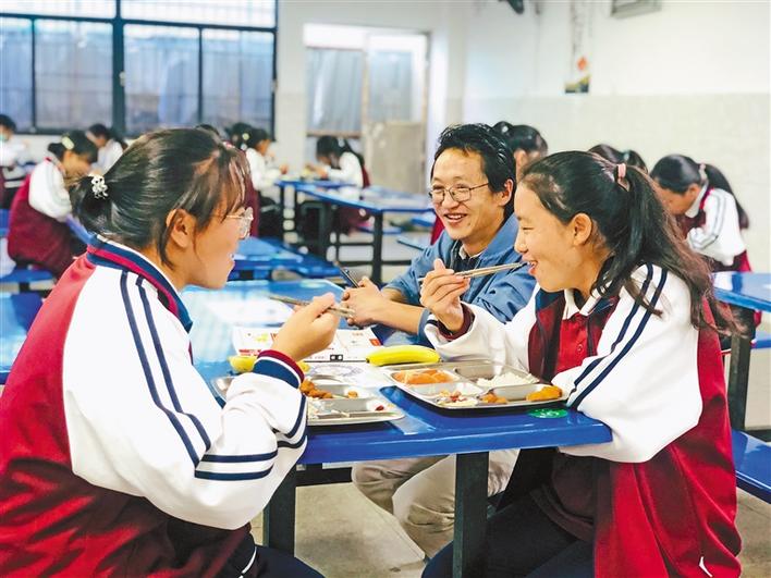 西藏青年報(bào)社副社長洛桑頓珠(右二)在珠海四中學(xué)校食堂與內(nèi)地西藏班學(xué)生進(jìn)行交談。