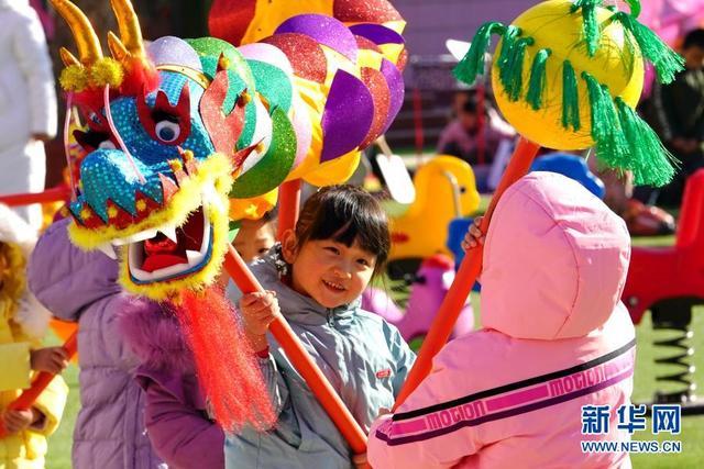12月14日,河北省樂亭縣第三幼兒園的孩子們在玩舞龍游戲。
