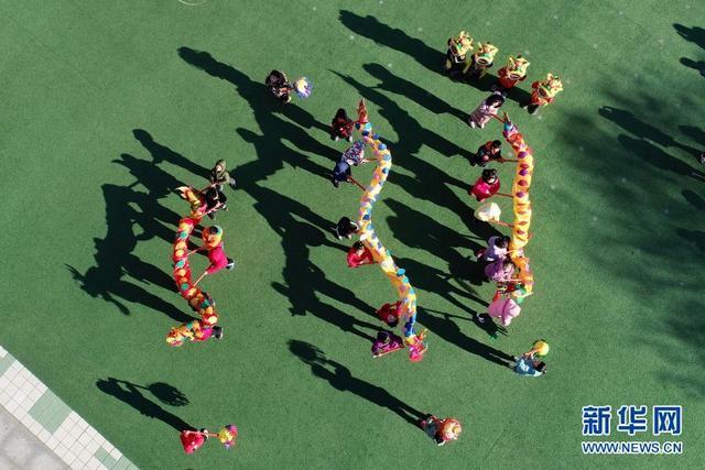 12月14日,河北省樂亭縣第三幼兒園的孩子們在玩舞龍游戲(無人機(jī)照片)。