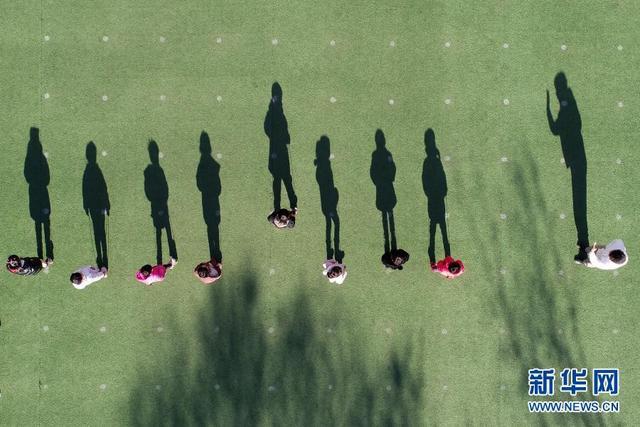 12月14日,河北省樂亭縣第三幼兒園的孩子們在玩踩高蹺游戲(無人機(jī)照片)。