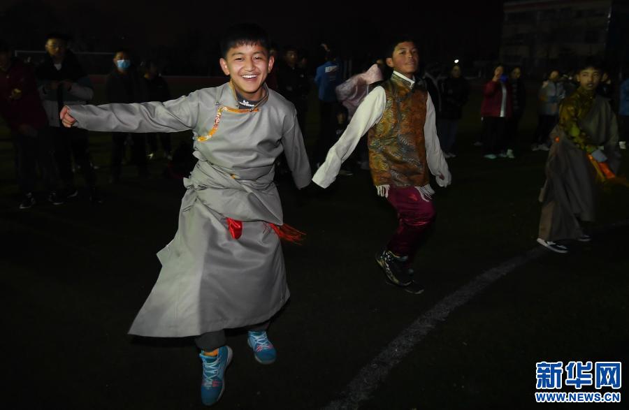 12日晚,夜幕降臨,華燈初上。伴隨著歡快的音樂聲,武漢西藏中學操場上,學生們變換著各種舞姿歡慶藏歷新年。