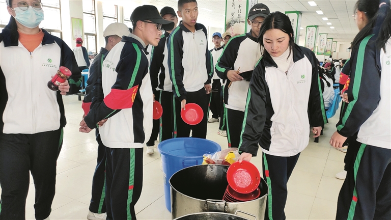 中午13時(shí),在拉薩北京實(shí)驗(yàn)中學(xué)食堂里,學(xué)生有序排隊(duì)取餐,根據(jù)“吃多少拿多少”的原則進(jìn)行點(diǎn)餐。用餐結(jié)束后,學(xué)生排隊(duì)放置碗筷,記者注意到,大多數(shù)學(xué)生用過的餐碗非常干凈,沒有浪費(fèi)主食的情況,用來裝食物殘?jiān)你锼袄锊]有多少被倒掉的殘羹剩飯。