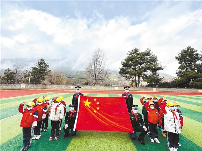 圖為林芝南伊邊境派出所民警與當(dāng)?shù)匦W(xué)生開展“我與國(guó)旗合影”活動(dòng)。張猛 馬智慧 攝