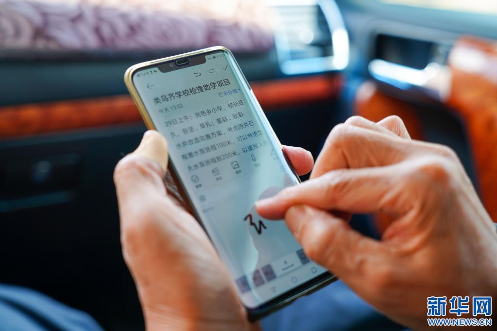 5月1日,李純民在前往西藏昌都市類烏齊縣伊日鄉(xiāng)小學(xué)途中,整理記錄此次進藏助學(xué)事宜。新華社記者 黃臻 攝