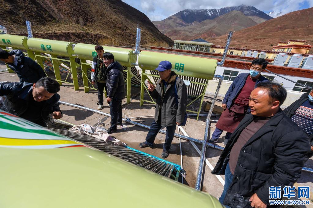 5月3日,在西藏昌都市類烏齊縣吉多鄉(xiāng)小學(xué),李純民(中)在吉多鄉(xiāng)小學(xué)學(xué)生食堂樓頂,監(jiān)督太陽能熱水器的維修工作。2014年至2020年,“齊興”助學(xué)獎勵基金通過多種方式,籌集資金200多萬,為類烏齊縣12所鄉(xiāng)鎮(zhèn)小學(xué)安裝太陽能熱水器和多媒體教學(xué)一體機。新華社記者 劉金海 攝