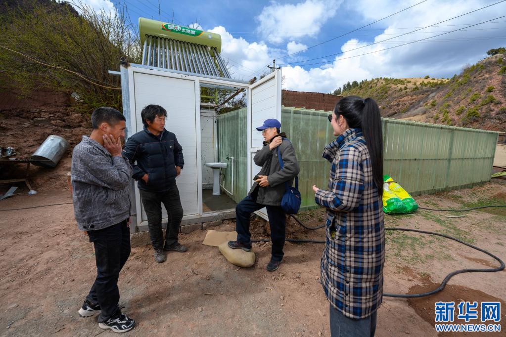 5月2日,李純民趕到西藏昌都市類烏齊縣濱達鄉(xiāng)濱達村,為當(dāng)?shù)卮迕裣虬桶偷菂f(xié)調(diào)太陽能熱水器的安裝調(diào)試工作。這是李純民(右二)通過濱達鄉(xiāng)小學(xué)老師索朗卓瑪(右一)作藏語翻譯,就熱水淋浴室與水沖廁整體改造計劃給向巴巴登(左二)提出建議。新華社記者 劉金海 攝
