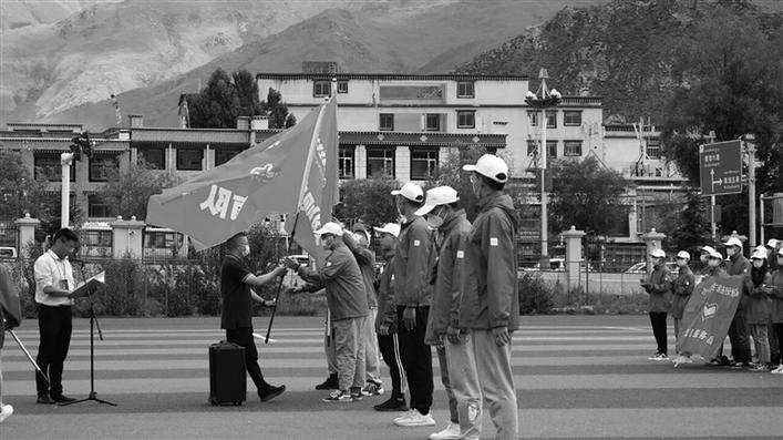 共青團(tuán)西藏自治區(qū)委員會(huì)副書(shū)記何華向各市地志愿者隊(duì)伍授旗。圖由團(tuán)區(qū)委提供