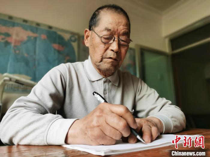圖為在青海西寧頤養(yǎng)天年的朱汝完向記者展示氣象發(fā)報(bào)基本功。 張?zhí)砀?攝