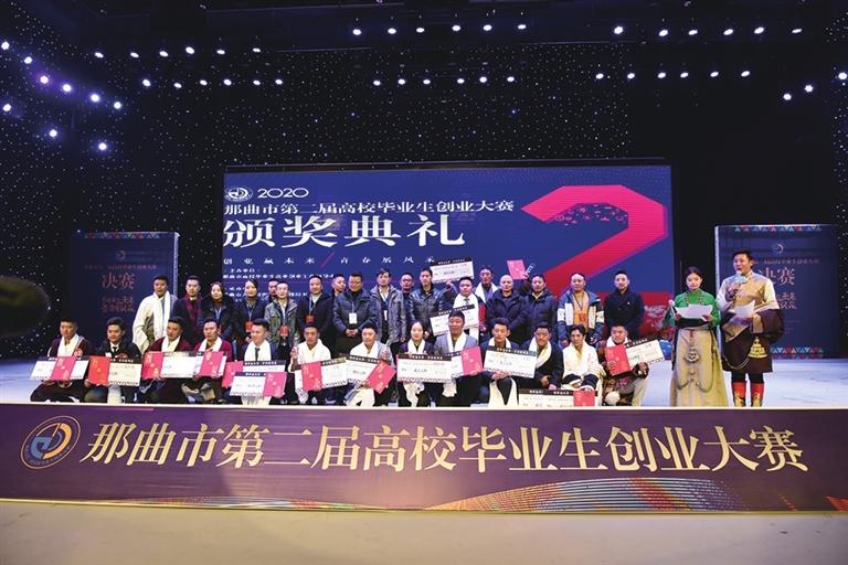圖為那曲市第二屆高校畢業(yè)生創(chuàng)業(yè)大賽頒獎(jiǎng)現(xiàn)場(chǎng)。