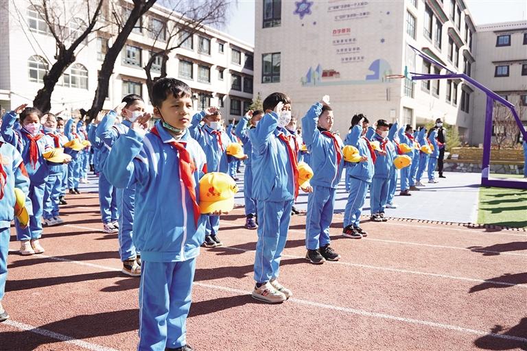 同樣,拉薩市城關(guān)區(qū)第二小學(xué)在開學(xué)第一天,舉行了2022年春季開學(xué)典禮暨創(chuàng)建鑄牢中華民族共同體意識(shí)示范學(xué)校啟動(dòng)儀式。從學(xué)生走入校門,到開學(xué)第一課“剛健有為、自強(qiáng)不息”,再到升國旗儀式,全體師生以嶄新的面貌,飽滿的熱情,積極投入到新學(xué)期的工作學(xué)習(xí)中。