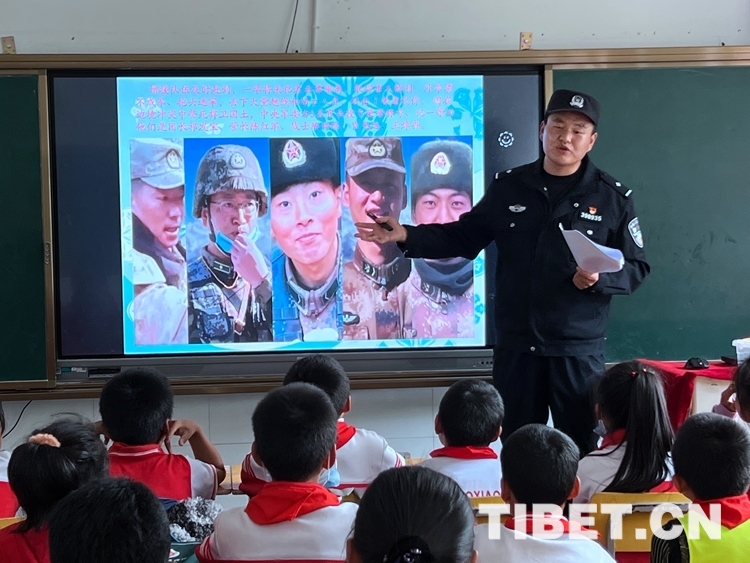 中國西藏網(wǎng)訊 “同學們,大家知道照片上這位英雄是誰嗎?”伴隨著民警周升展的提問聲,孩子們紛紛舉起手回答出了這位英雄——祁團長?!澳銈冋媛斆鳎裉焓迨褰o大家講一講新時代衛(wèi)國戍邊英雄祁發(fā)寶團長的故事……”