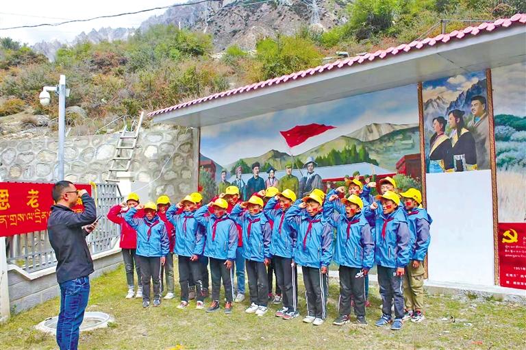 圖為鄉(xiāng)黨委干部引領(lǐng)學(xué)生在學(xué)校“首面紅墻”旁重溫少先隊員誓詞。記者 索朗瓊珠 次仁片多 攝