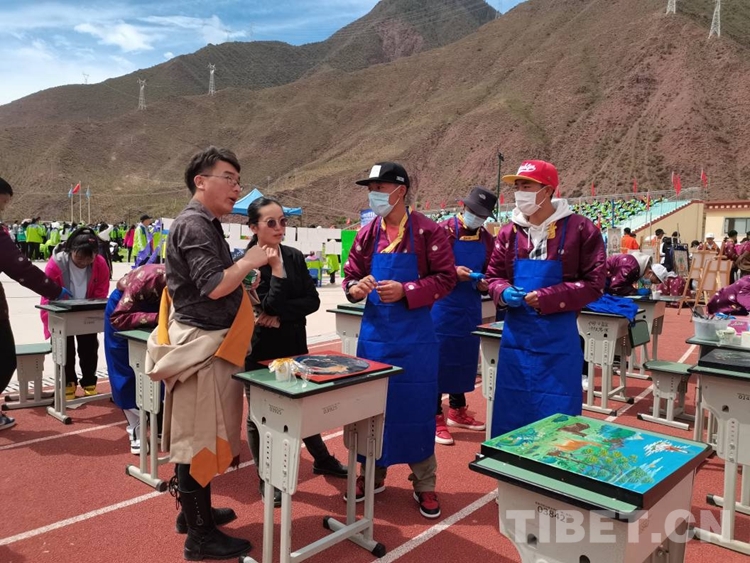 圖為扎西格勒老師教授唐卡漆畫專業(yè)同學作畫