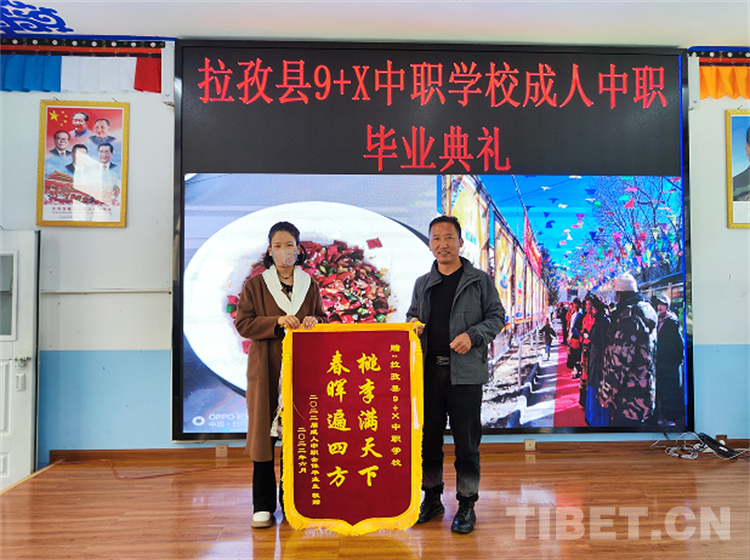 典禮上,拉孜縣9+X中職學校校長旦珍旺加對廣大畢業(yè)生殷殷囑托,希望他們在今后的工作崗位上事業(yè)有成、蒸蒸日上。隨后由成人中職學校代表、學生家長向學校贈送錦旗,以感謝學校一直以來為學生們提供學習與實踐平臺,為孩子們培養(yǎng)技能。
