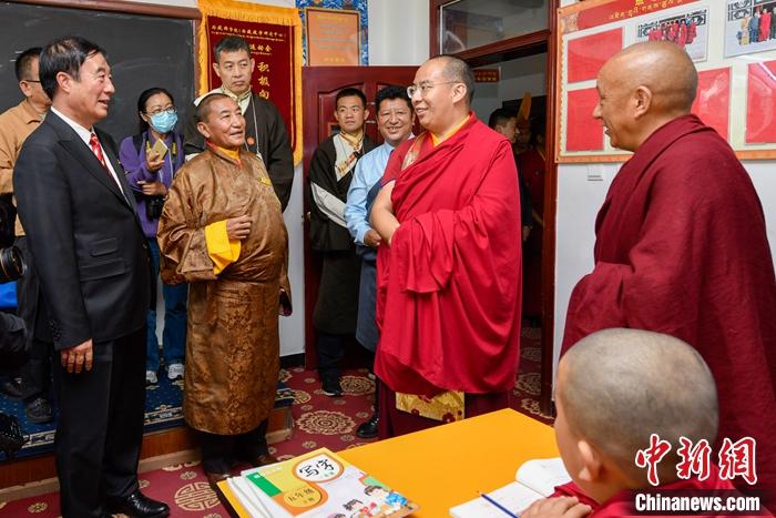 6月16日,班禪來(lái)到西藏佛學(xué)院少年活佛班,了解少年活佛們的學(xué)習(xí)、生活情況。中新社發(fā) 李林 攝