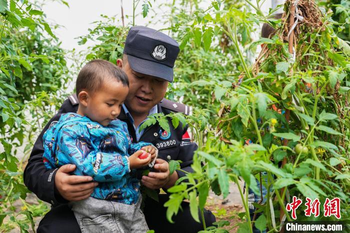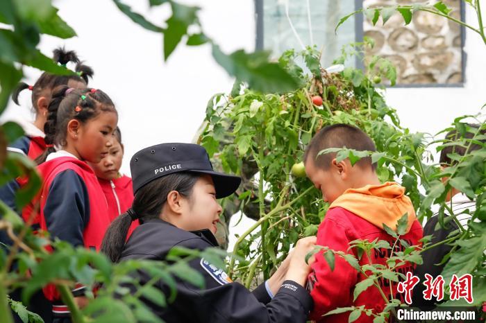 圖為亞東出入境邊防檢查站民警與龐達村雙語幼兒園小朋友共同采摘成熟了的西紅柿?!±铄\輝 攝