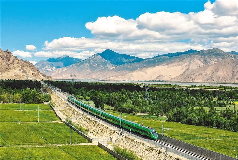 中央支持西藏自治區(qū)基本建成涵蓋公路、鐵路、航空、管道等多種運輸方式的綜合立體交通網(wǎng)絡。2021年6月25日,川藏鐵路拉林段正式開通運營。圖為開通當日,復興號高原內(nèi)電雙源動車組首次開上青藏高原。