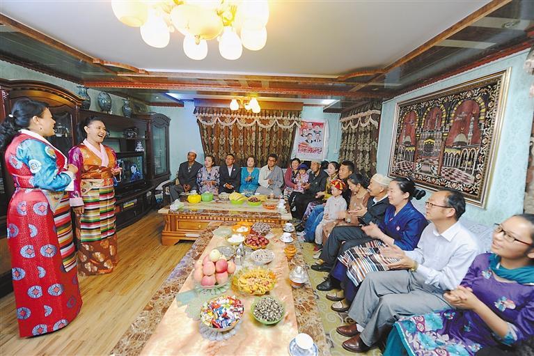 著力創(chuàng)建全國民族團結進步模范區(qū)。截至2022年5月,全區(qū)共有國務院、西藏自治區(qū)表彰的民族團結進步模范集體1934個,模范個人2846人。圖為2021年2月13日,西藏自治區(qū)拉薩市吉崩崗社區(qū)各族群眾在同一天共度農歷新年和藏歷新年。